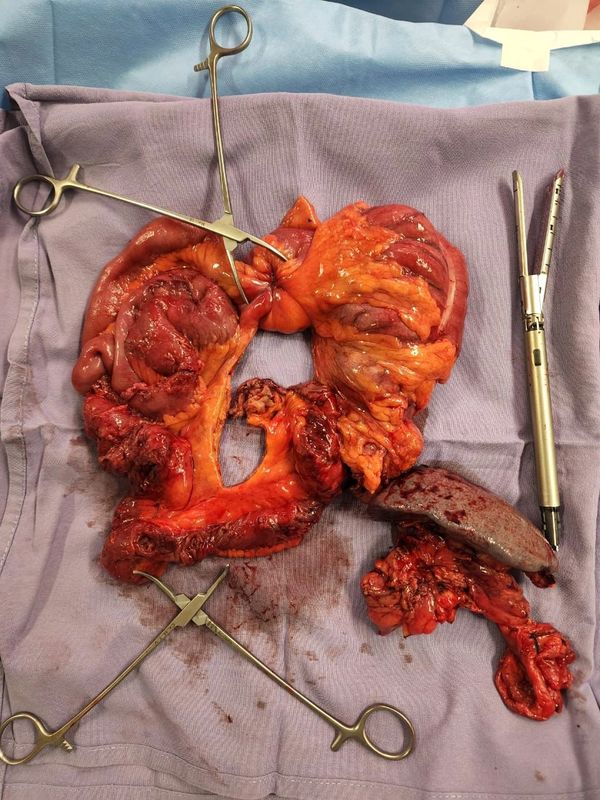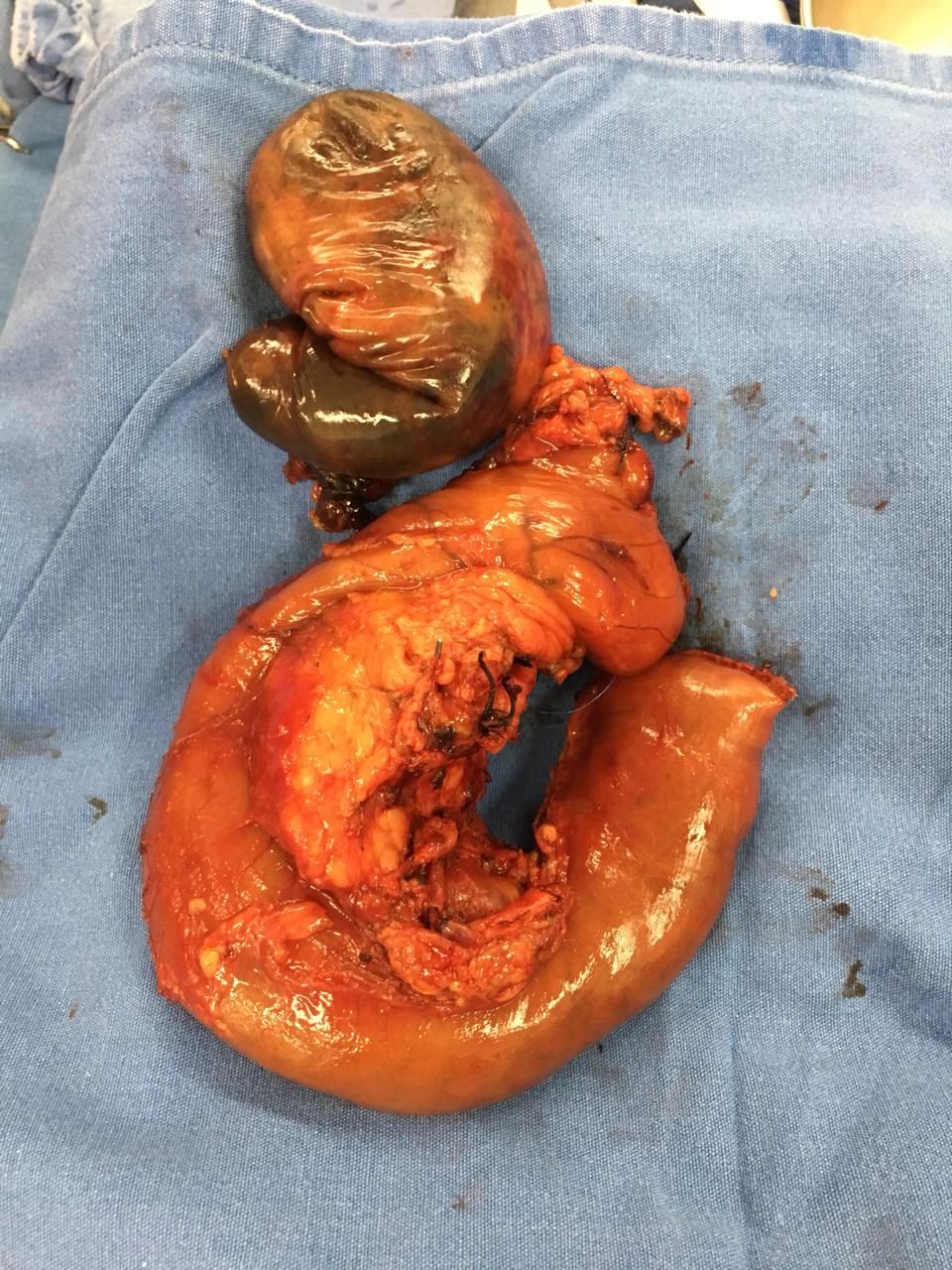 Se obersrva una Cirugia de Whipple pancreatoduodenectomia . es decir resección de la parte distal del estomago , duodeno, vesícula y cabeza de páncreas.