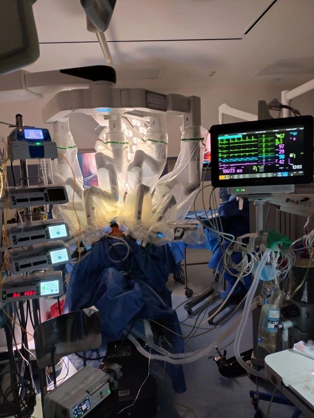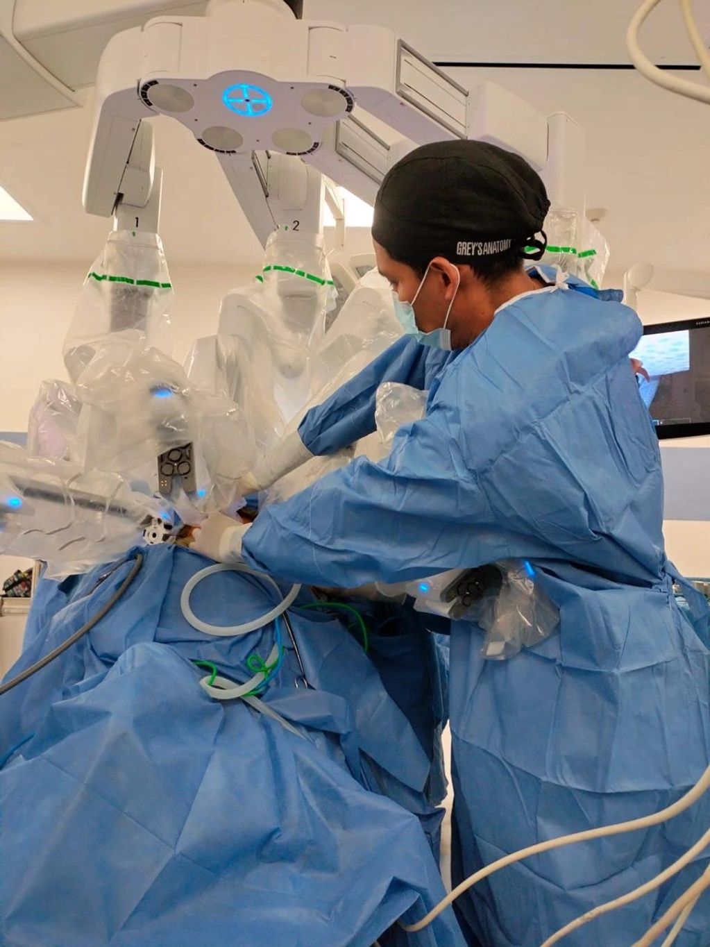 Este paciente requería la extracción completa del estomago debido al cáncer. La operación por métodos tradicionales era muy peligrosa y muy tardada la recuperación, así que se decidió emplear un robot llamado Da Vincci IX el cual no es tan invasivo ya que solo se hacen unos pequeños orificios donde los "brazos" del robot entren y el doctor a través de este pueda hacer el corto y todo lo necesario